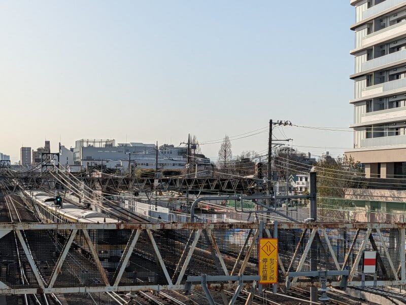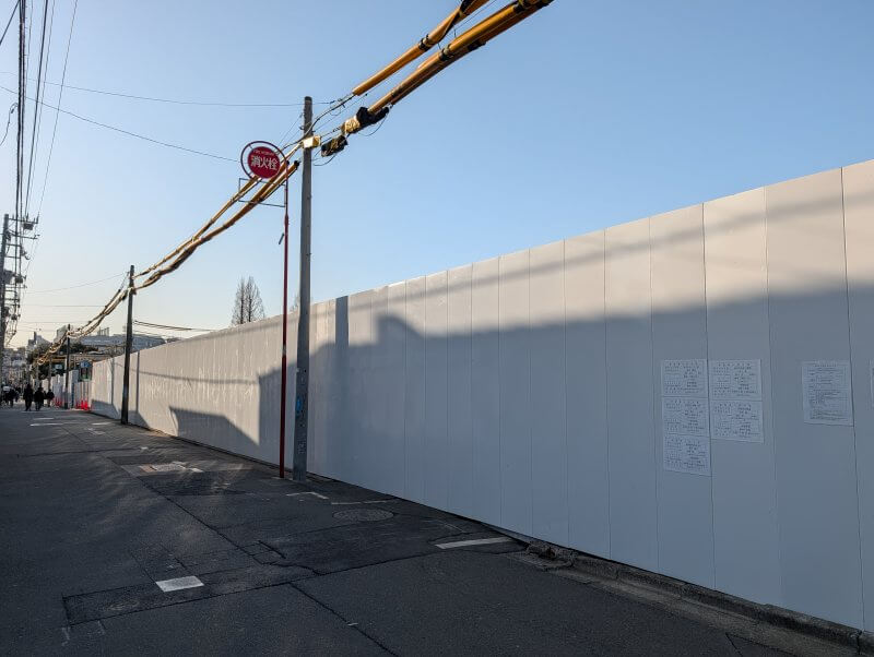 再開発の敷地の南側の、中央線の線路と再開発の敷地の間の道路側を見た様子です。