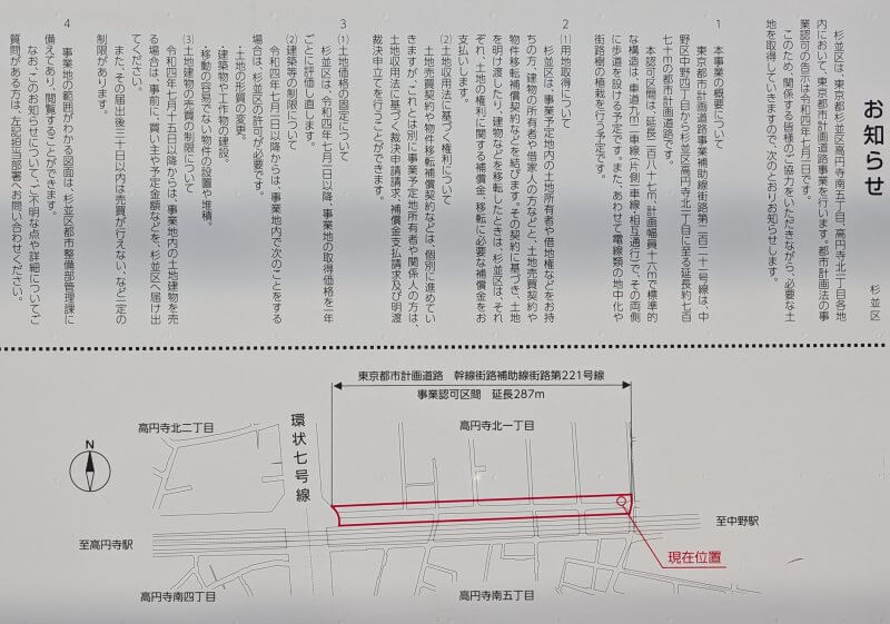 「たかはら公園」に、東京都市計画道路幹線街路補助線街路第221号線のお知らせが掲示されていました。お知らせは杉並区からとなっていて、「たかはら公園」と「囲町西地区第一種市街地再開発事業」の間が、杉並区と中野区の区の境となっていました。