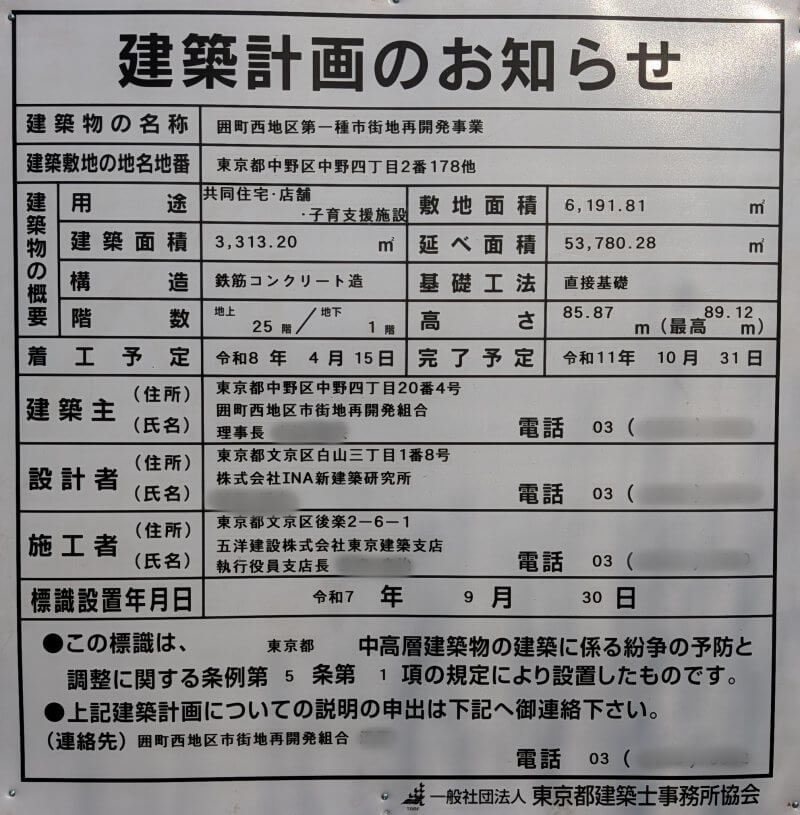 「パークシティ中野 ザ タワー エアーズ/ザ タワー ブリーズ」の西側エリアで進められている再開発の、25階89m「囲町西地区第一種市街地再開発事業」の様子です。