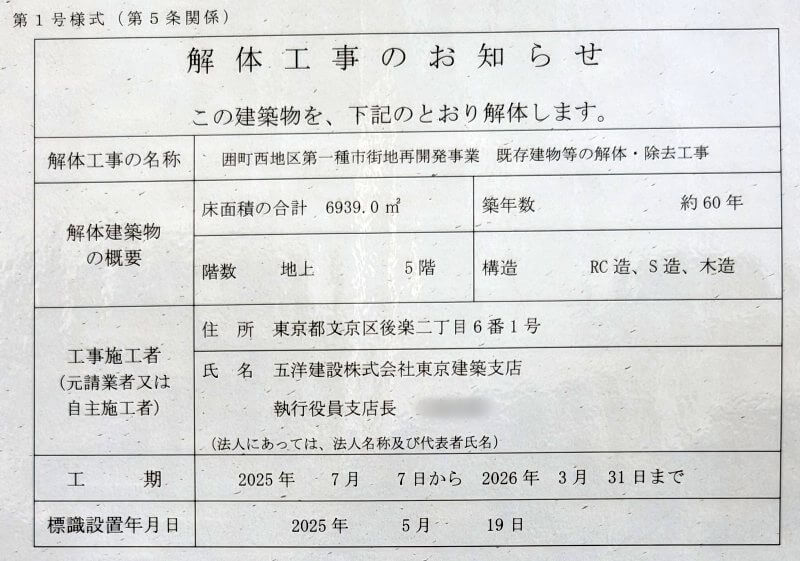 現地に掲示されていた、解体工事のお知らせです。解体工事の工期は、2026年3月31日までとなっていました。
