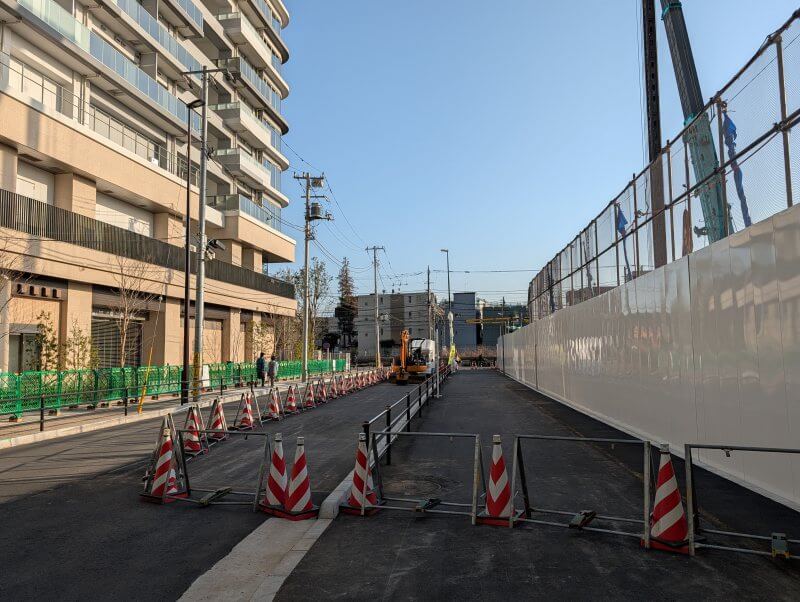 「囲町西地区第一種市街地再開発事業」の敷地と、「パークシティ中野 ザ タワーブリーズ」の間の道路を見た様子です。