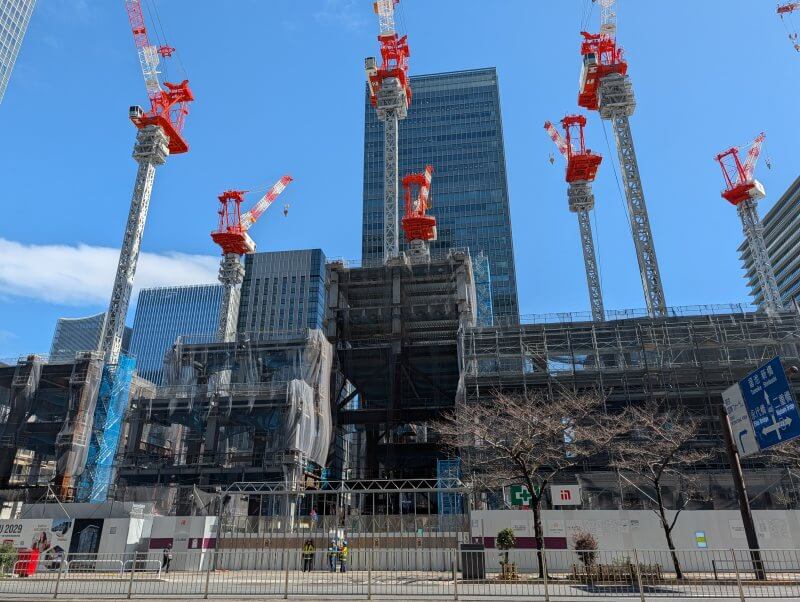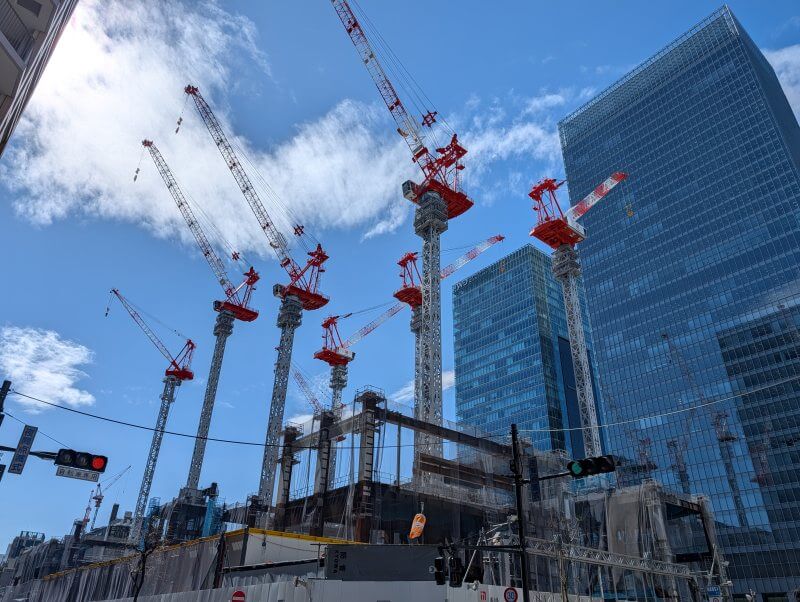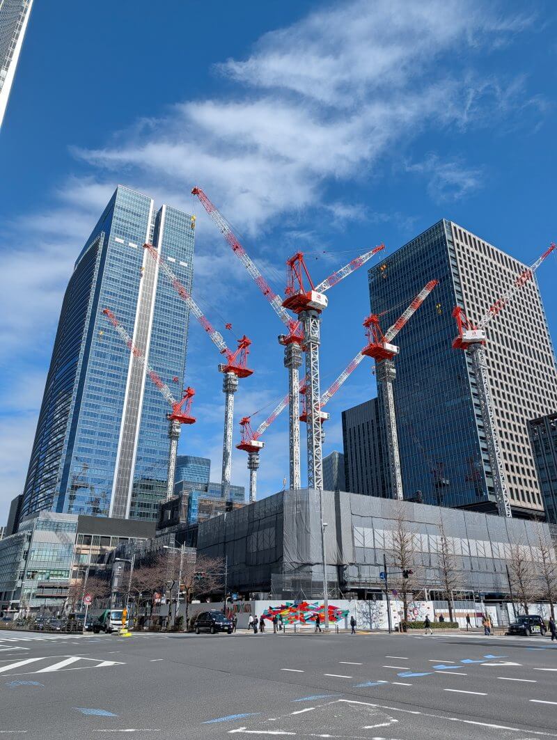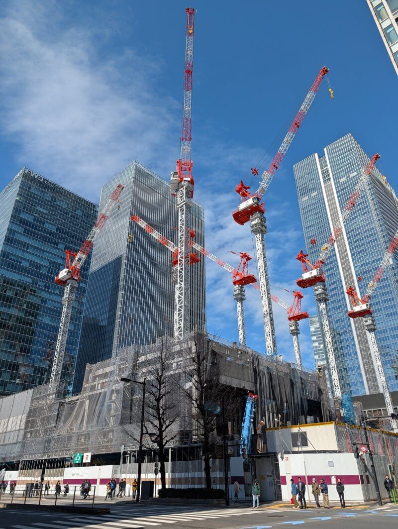 外堀通りと鍛冶橋通りの交差点から、再開発の敷地を見た様子です。タワークレーンが8基出現していました。