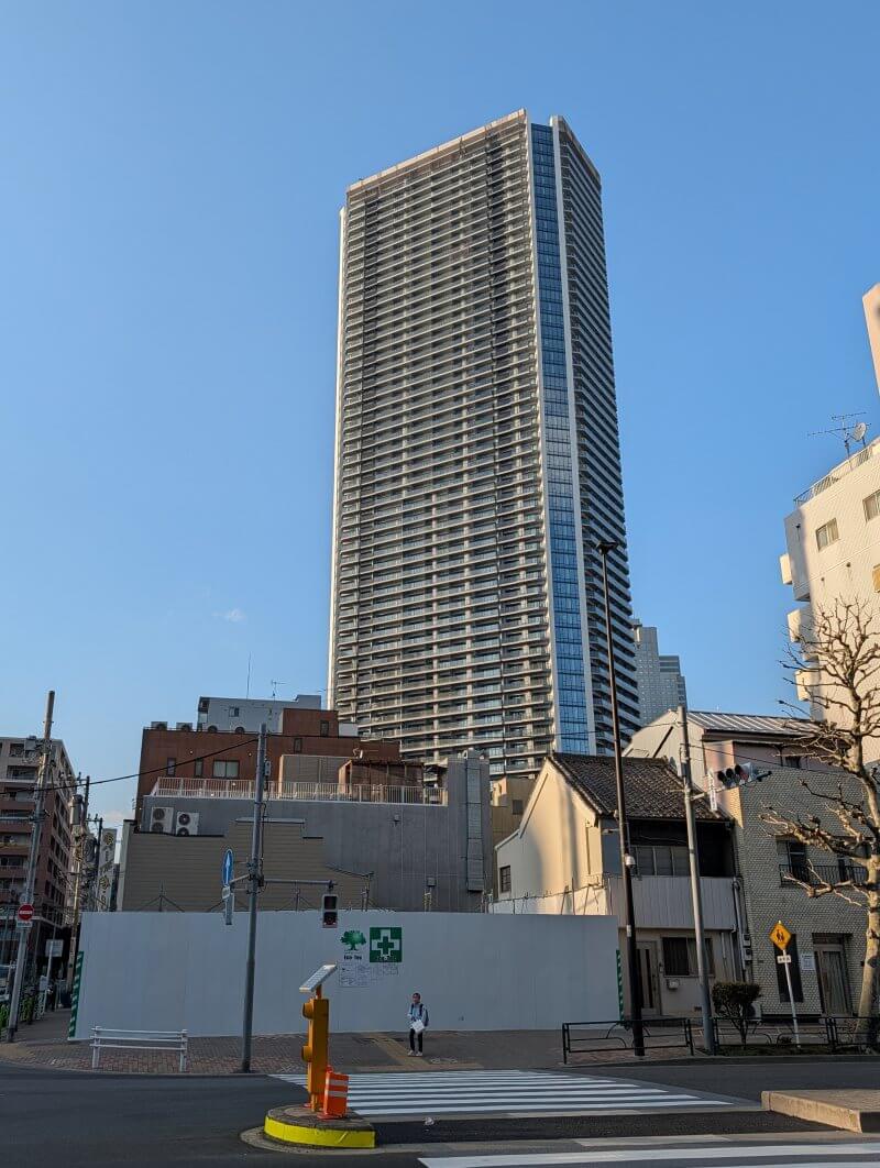 西仲通り(月島もんじゃストリート)側に移動して、建物低層階を見た様子です。