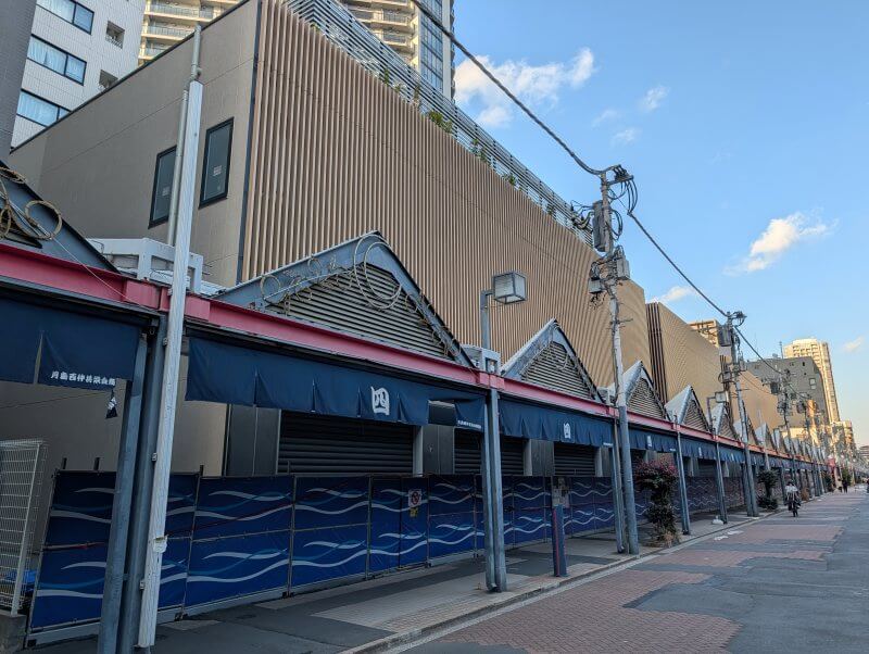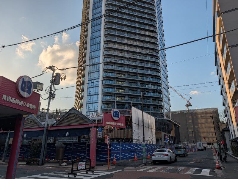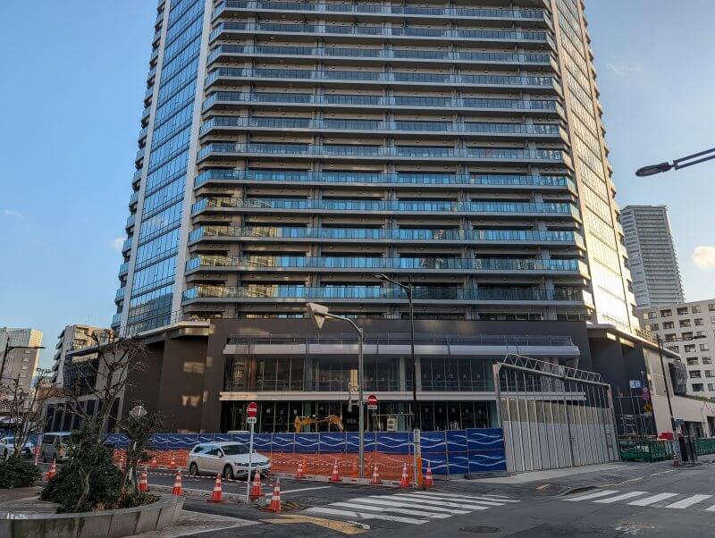 西仲通り(月島もんじゃストリート)沿いを見た様子です。西仲通り沿いの、商業施設棟側を見た様子です。こちらはどんなお店がオープンするのか楽しみです。