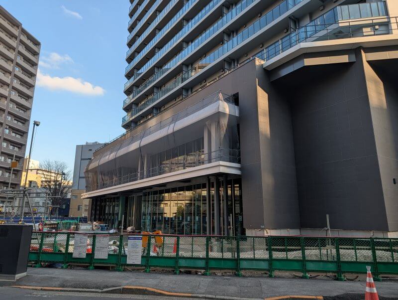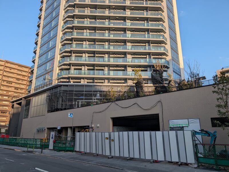 建物は上棟しており、低層階の整備も進み、工事用の白いパネルも取れて、建物の周囲の植栽工事が行われていました。