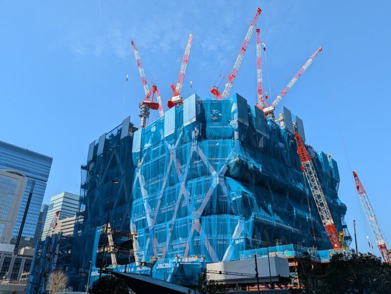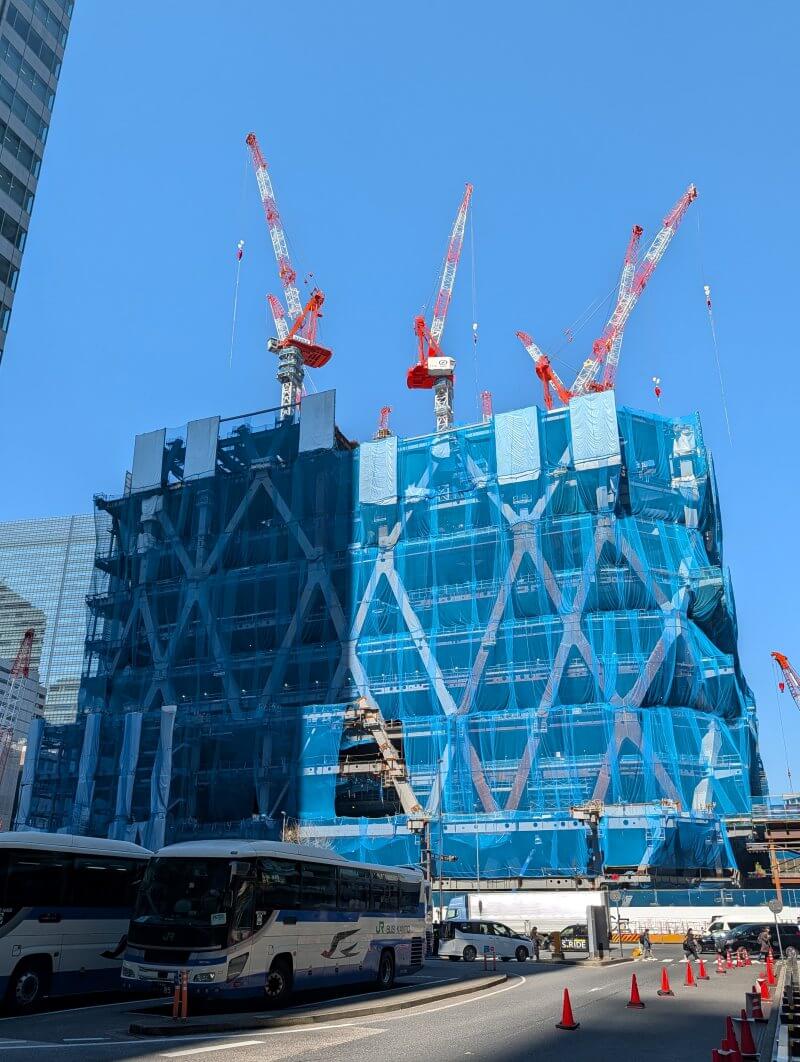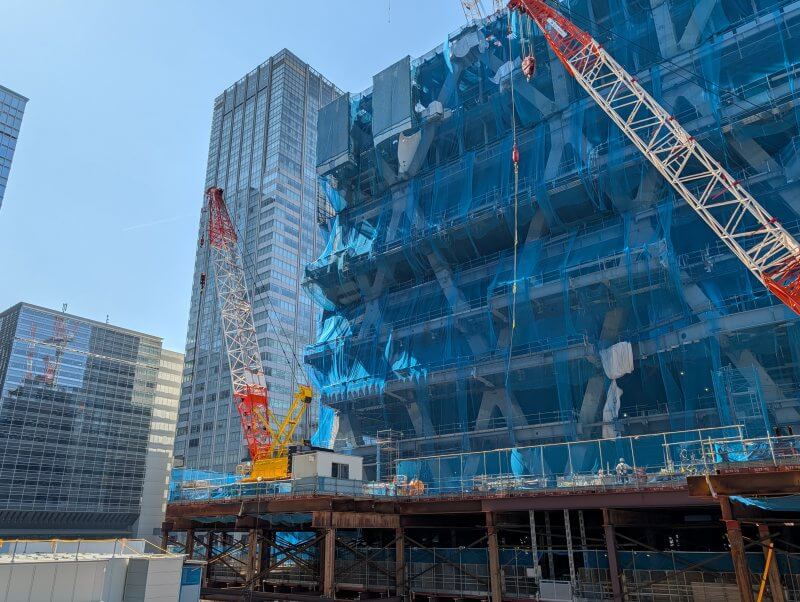 JRの高架をくぐり抜けて西側に移動し、新丸の内センタービルそばから、施工中の建物を見た様子です。