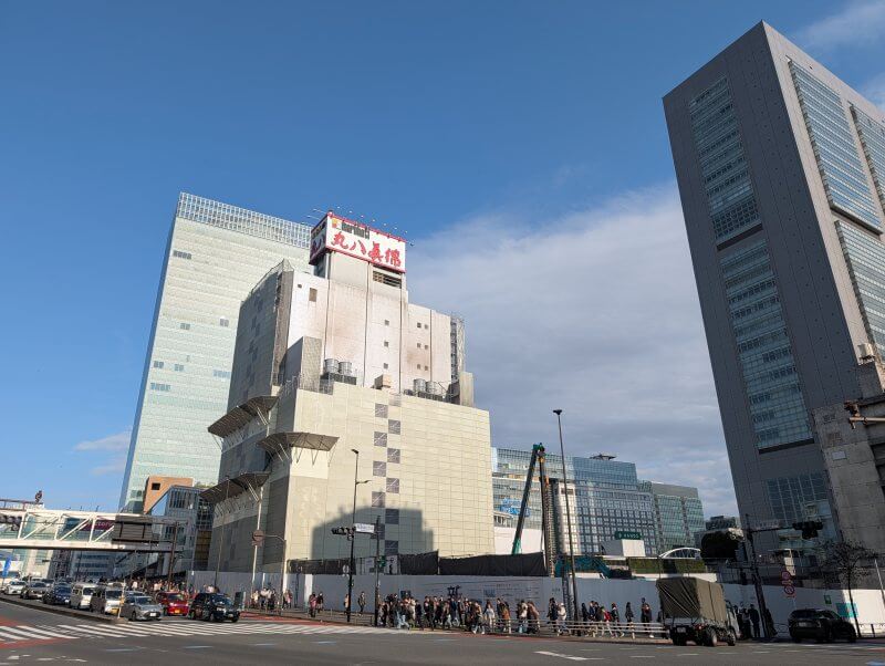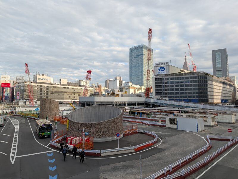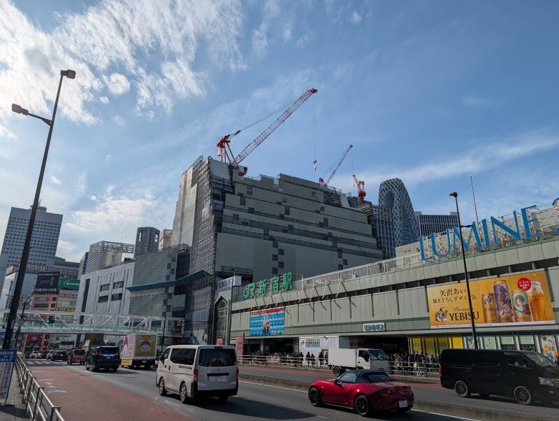 新宿駅のミライナタワー口から甲州街道沿いに出て、解体工事中の「新宿ミロード」跡地を見た様子です。