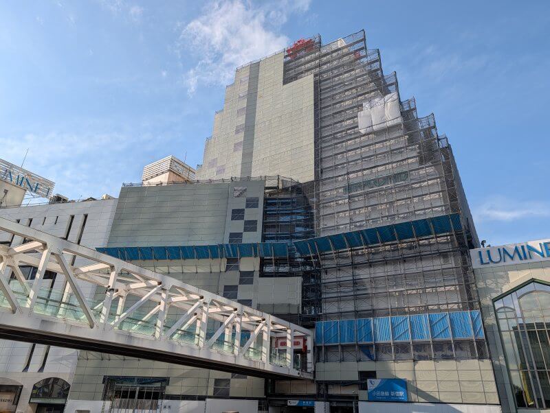 サザンテラスを南側に移動して、解体工事中の「新宿ミロード」跡地を見た様子です。「ミヤコ新宿ビル」跡地も、解体工事用の足場が設置されてきていました。ふとんの丸八の看板が、見えなくなる日も近いのだと思います。