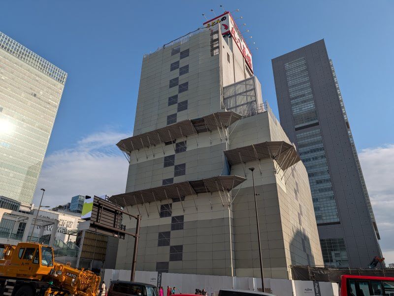 甲州街道沿いに新宿駅南口側に移動して、ミロードデッキ近くから、解体工事中の「新宿ミロード」跡地を見た様子です。解体工事用の足場が、徐々に設置されてきていました。もうしばらくすると、解体工事用の足場で覆われて、外観が見えなくなると思います。