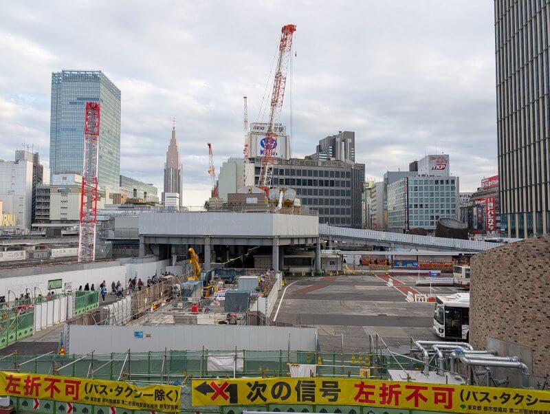 新宿駅西口側に移動して、「新宿エルタワー」そばの歩行者デッキから、建替え工事中の小田急百貨店跡地側を見た様子です。