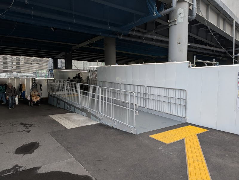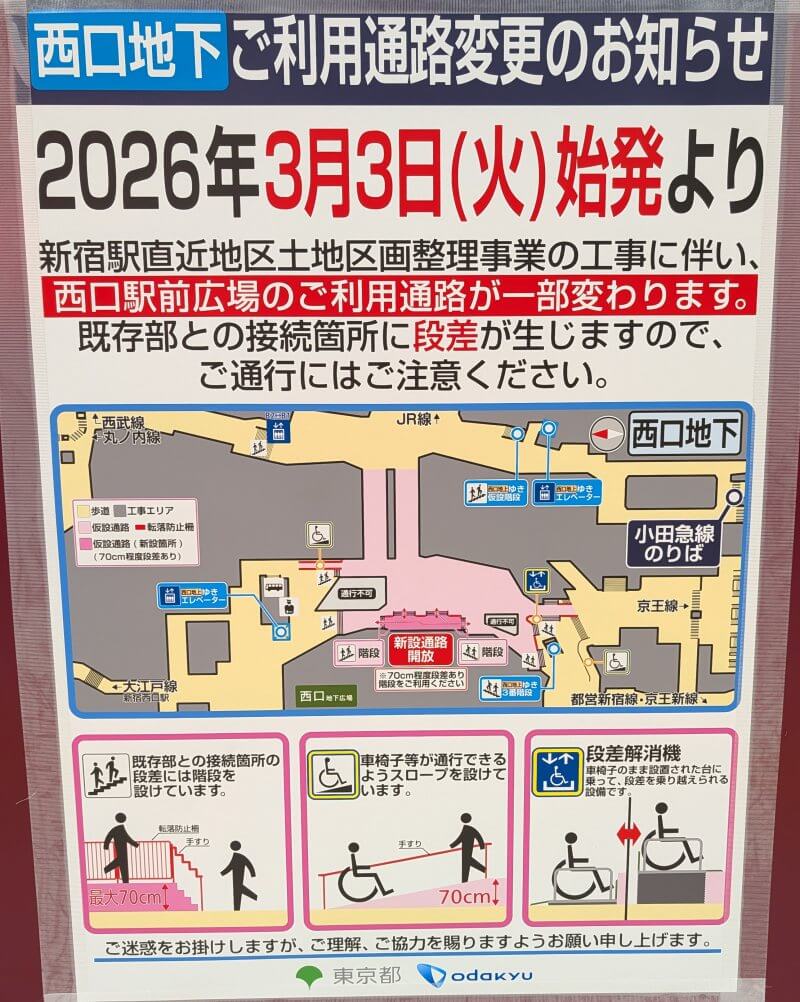 2月17日に、利用通路の一部が変更された、新宿駅西口地上通路の様子です。新宿駅西口側の通路に段差が出来て、西側にスロープが設置されていました。歩く人はあまり意識しないかもしれませんが、足の不自由な方など、注意が必要かと思いました。