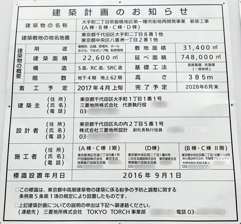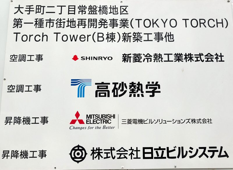 現地に掲示されていた、工事関連の案内です。空調工事は、新菱冷熱工業・高砂熱学が携わっています。昇降機工事は、三菱電機ビルソリューションズ・日立ビルシステムが携わっています。