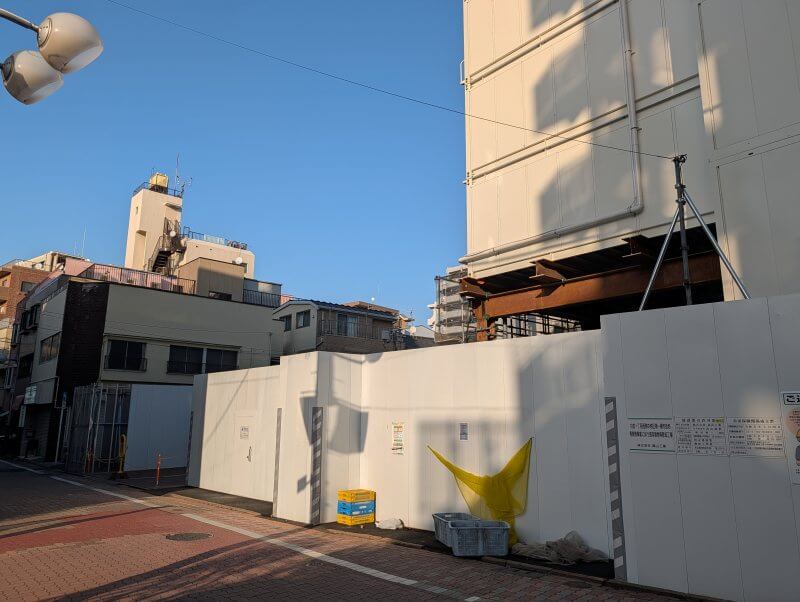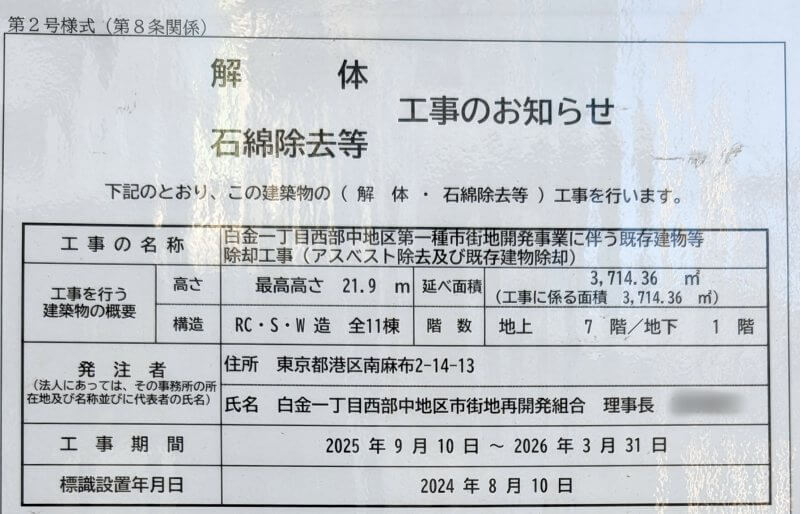 現地は既存建物が解体済みになっており、建築計画のお知らせが出現していました。建築計画のお知らせによると、着工が令和7年10月27日と記載されていたので、既に着工していました。