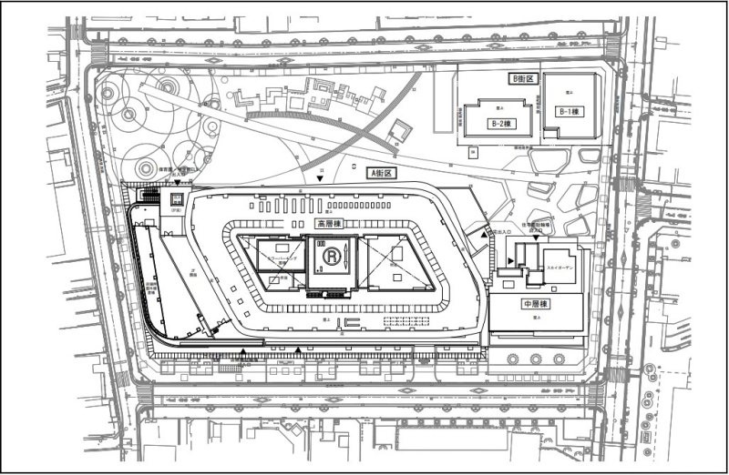 以下、港区の資料より、配置図です。高層棟が敷地南側に施工され、4階建てのB棟が北東側に出来る予定です。高層棟のA棟と低層棟のB棟の間は、自由通路が出来るように配置図が描かれていました。