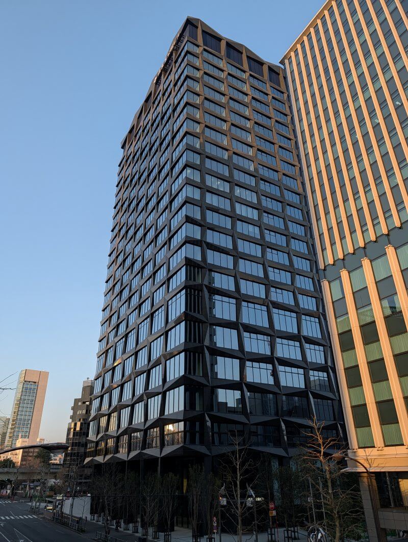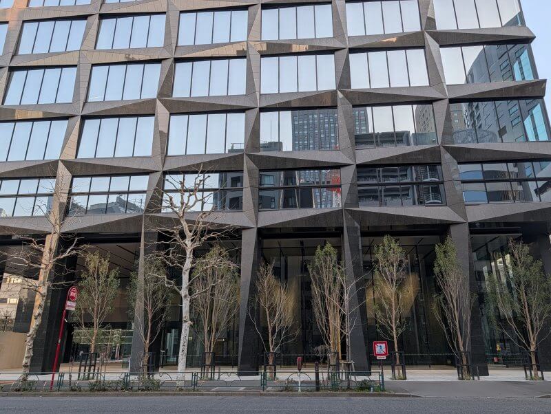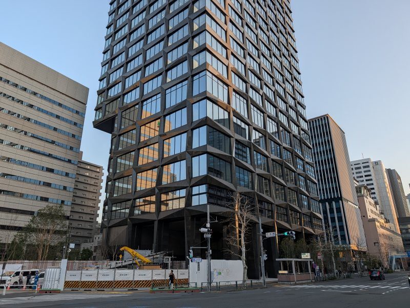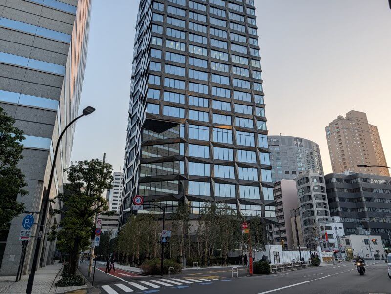 芝園橋交差点から、建物の低層階を見た様子です。建物は完成して工事用の柵が取れていましたが、手前の芝公園駅と繋がる出入口付近が工事中で、工事用の柵で覆われていました。