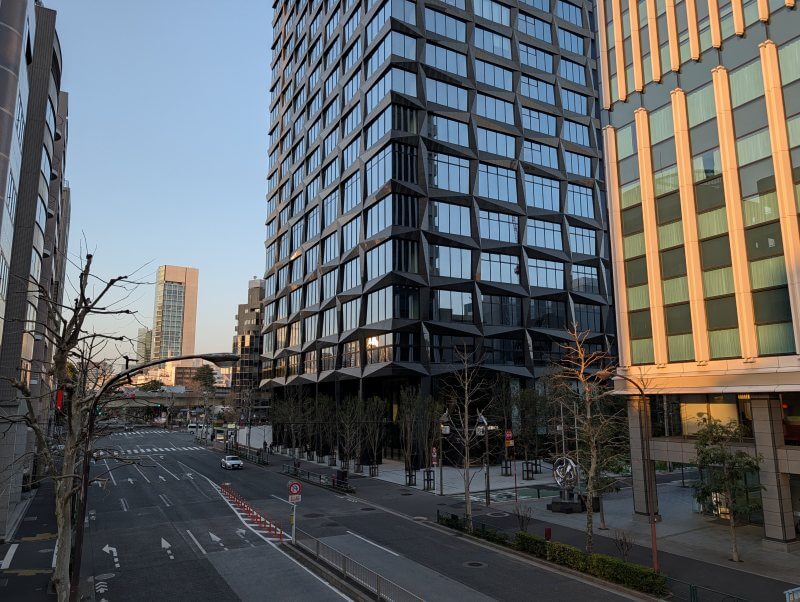 日比谷通りの道路の反対側の、西側から建物低層階を見た様子です。