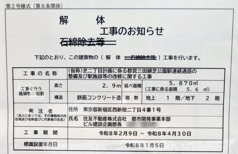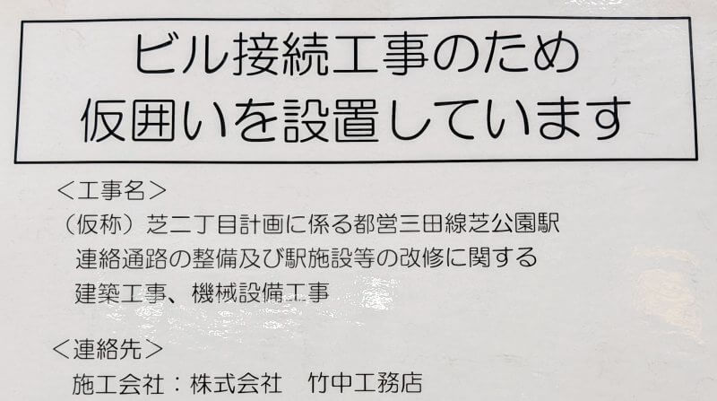 芝公園駅との地下通路を工事しているところに、「(仮称)芝二丁目計画に係る都営三田線芝公園駅連絡通路の整備及び駅施設等の改修に関する工事」のお知らせが掲示されていました。標識設置年月日が、令和8年1月5日になっていたので、今年になって新しく設置された標識でした。