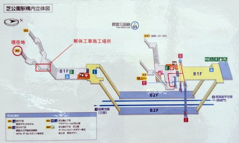 芝公園駅構内立体図です。A1出口を降りた場所で連絡通路の工事が行われていました。